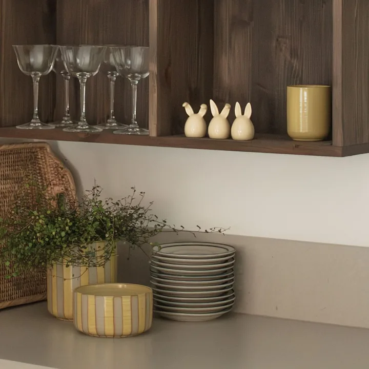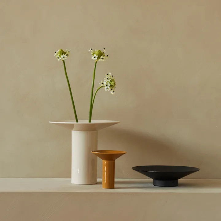Lue sisustusvinkkejä ja uusimmat sisustustrendit Nordic Nestistä. Tässä näet Marimekon keltaisen maljakon, jossa on oransseja tulppaaneja.
