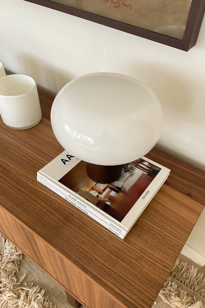 Karl-Johan merkiltä New Works on täydellinen sienilamppu, jolla voit sisustaa kotisi, kuten ruotsalainen vaikuttaja @joanna.avento on tehnyt. Kuten arvata saattaa, se on saanut inspiraationsa Karl Johan -sienen orgaanisesta muodosta, joka antaa kodillesi pehmeän ja tyylikkään vaikutelman. Valkoisen lampunvarjostimen ja pähkinäpuisen lampunjalustan välinen kontrasti on silmiinpistävä ja tyylikäs.