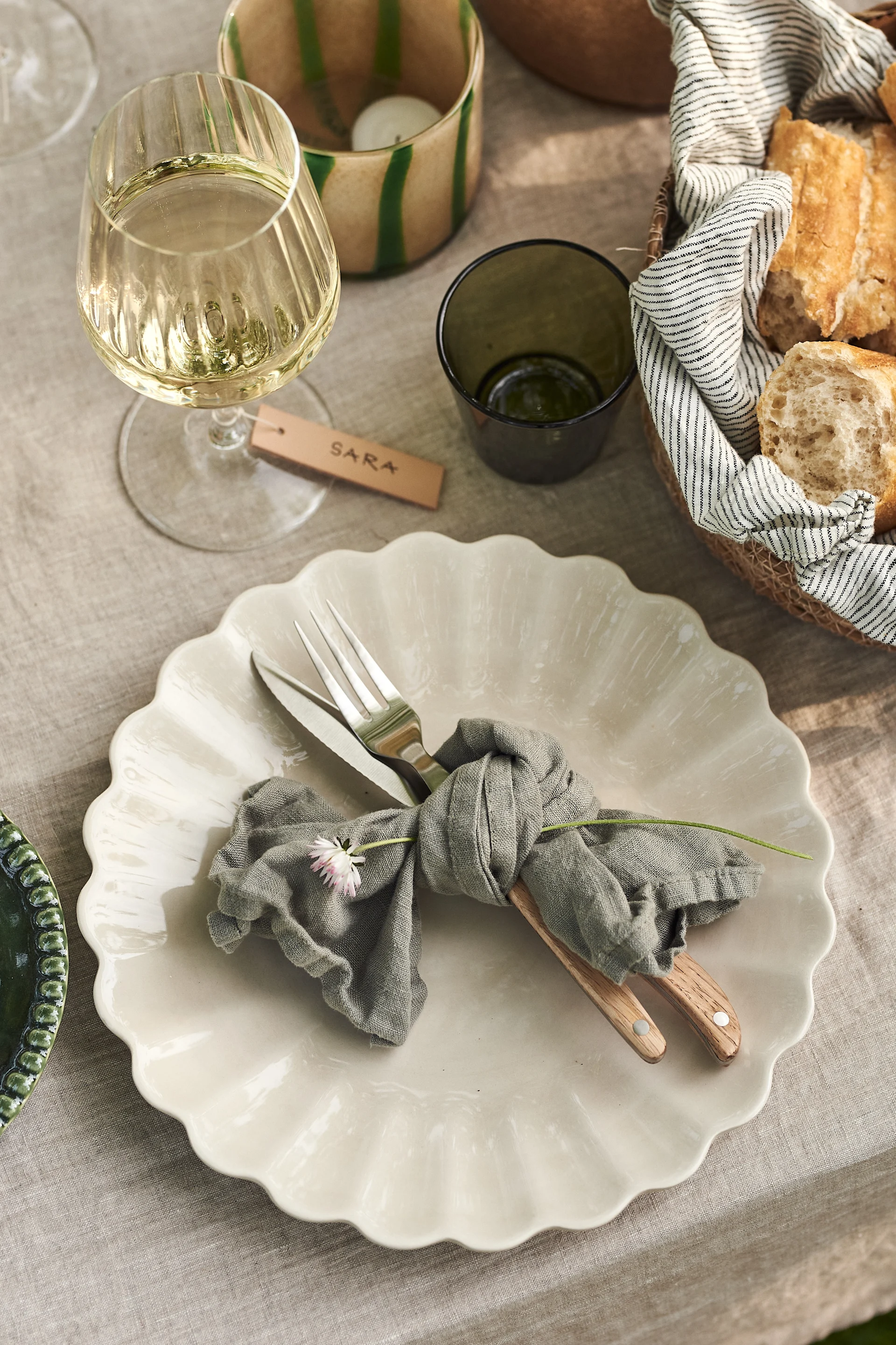 Yhdistä Dots vihreä lautanen merkiltä PotteryJo merkin Mateus beige Oyster laustasten kanssa luodaksesi tyylikästä kontrastia kesän kattaukseen puutarhassa.