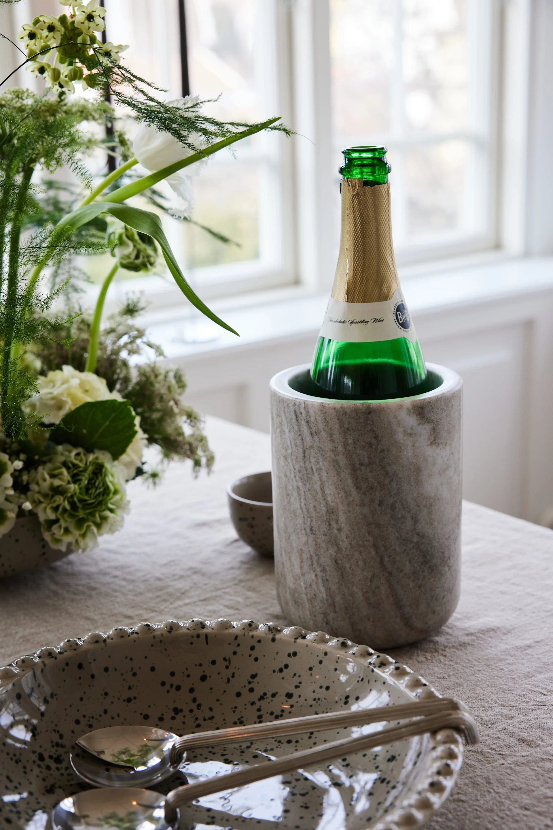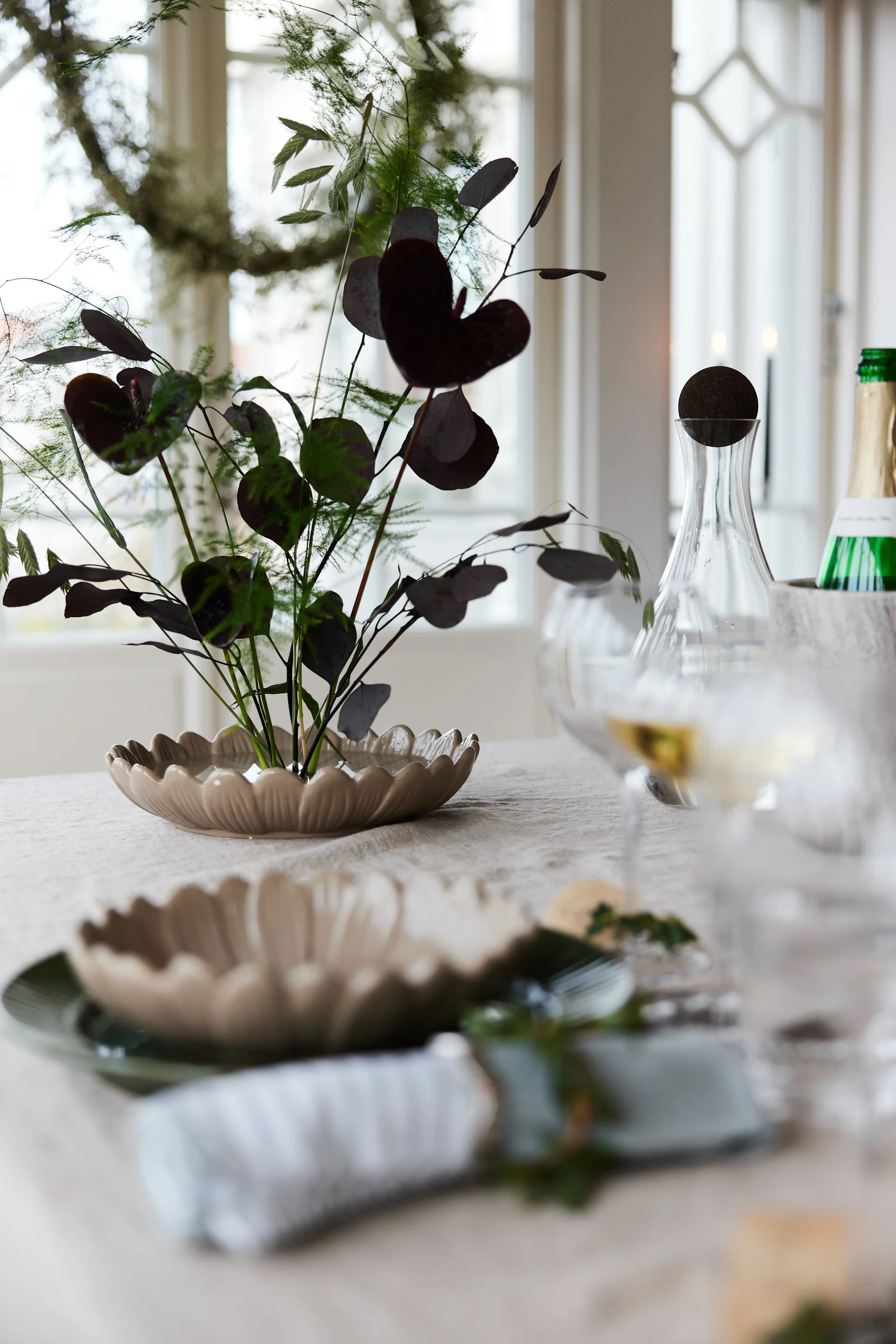 Luonnolliset materiaalit ja hillitty värimaailma antavat tälle pöytäasetelmalle lämpimän ja kutsuvan ilmeen. Pilkullisella lasitteella varustetut kivitavara-astiat, pellavatekstiilit ja yksinkertaiset kynttilänjalat luovat rennon mutta tyylikkään tunnelman. Astioiden käsityönä tehty ilme tuo pöytään luonnetta, ja pehmeä valaistus ja hienot yksityiskohdat viimeistelevät tunnelman - ihanteellinen kodikkaalle aterialle, jolla on erityistä charmia.