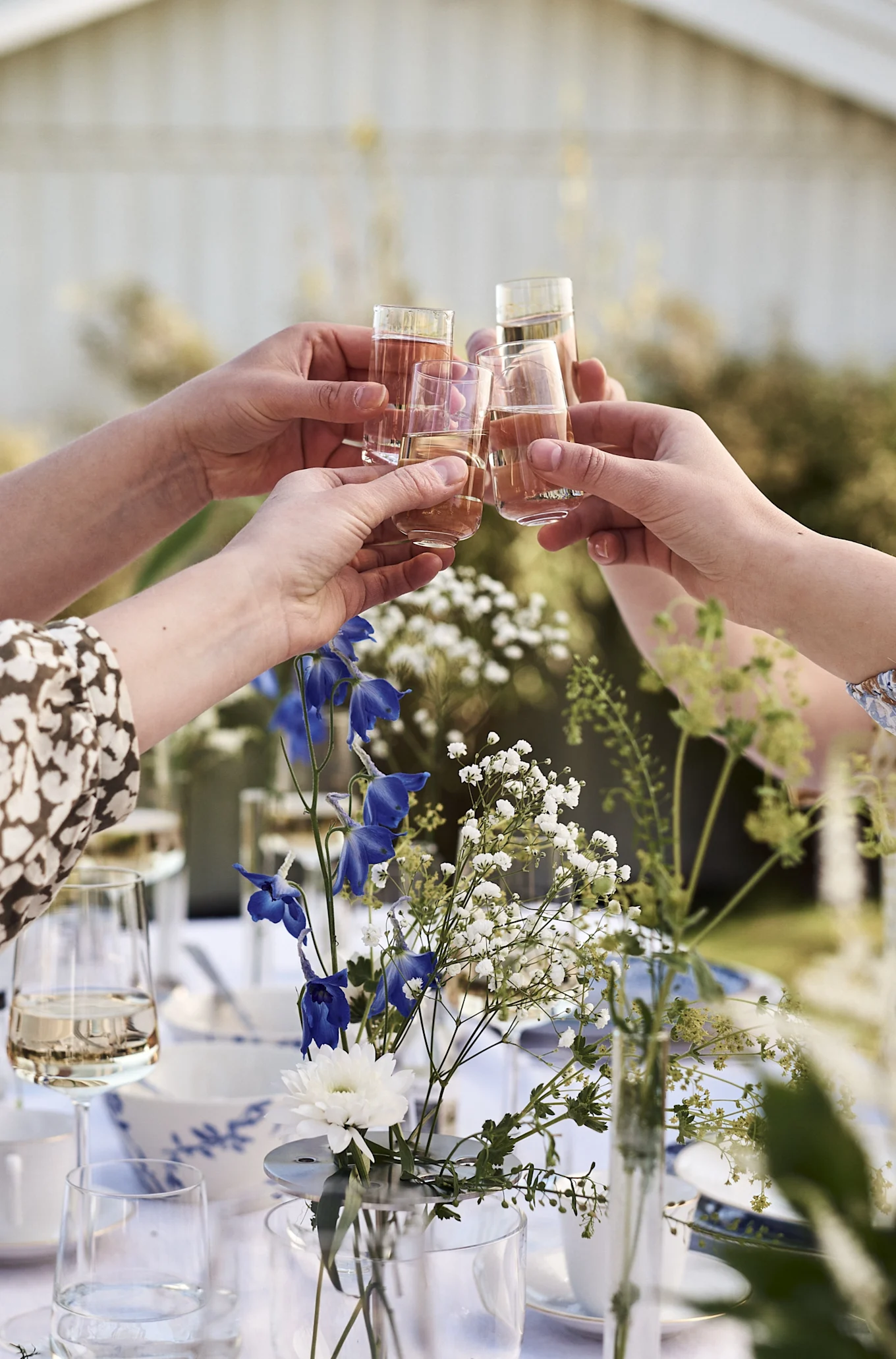 Juhannuksessa on kyse ruokailusta ulkona auringonpaisteessa. Pöytä katetaan perinteisesti sinivalkoisella posliinilla, jossa on kesäisten mansikoiden punaisia vivahteita. Aloita kattaus raikkaalla valkoisella pöytäliinalla ja tyylikkäillä laseilla. Uskalla yhdistellä eri kuvioita ja tyylejä, sillä kunhan posliinin sävy on sama, voit olla varma, että ne täydentävät toisiaan. Tässä klassisessa juhannuspöydän kattauksessa on käytetty merkin Rörstrand ajattomia Ostindia ja Ostindia Floris -posliinilautasia, jotka tuovat tyylikkyyttä. Lisää pöytään korkeutta ja vehreyttä maljakoissa olevilla kesäkukilla, ja vuoden ensimmäisten mansikkasatojen kulhojen väriloisto ilahduttaa varmasti vieraita.