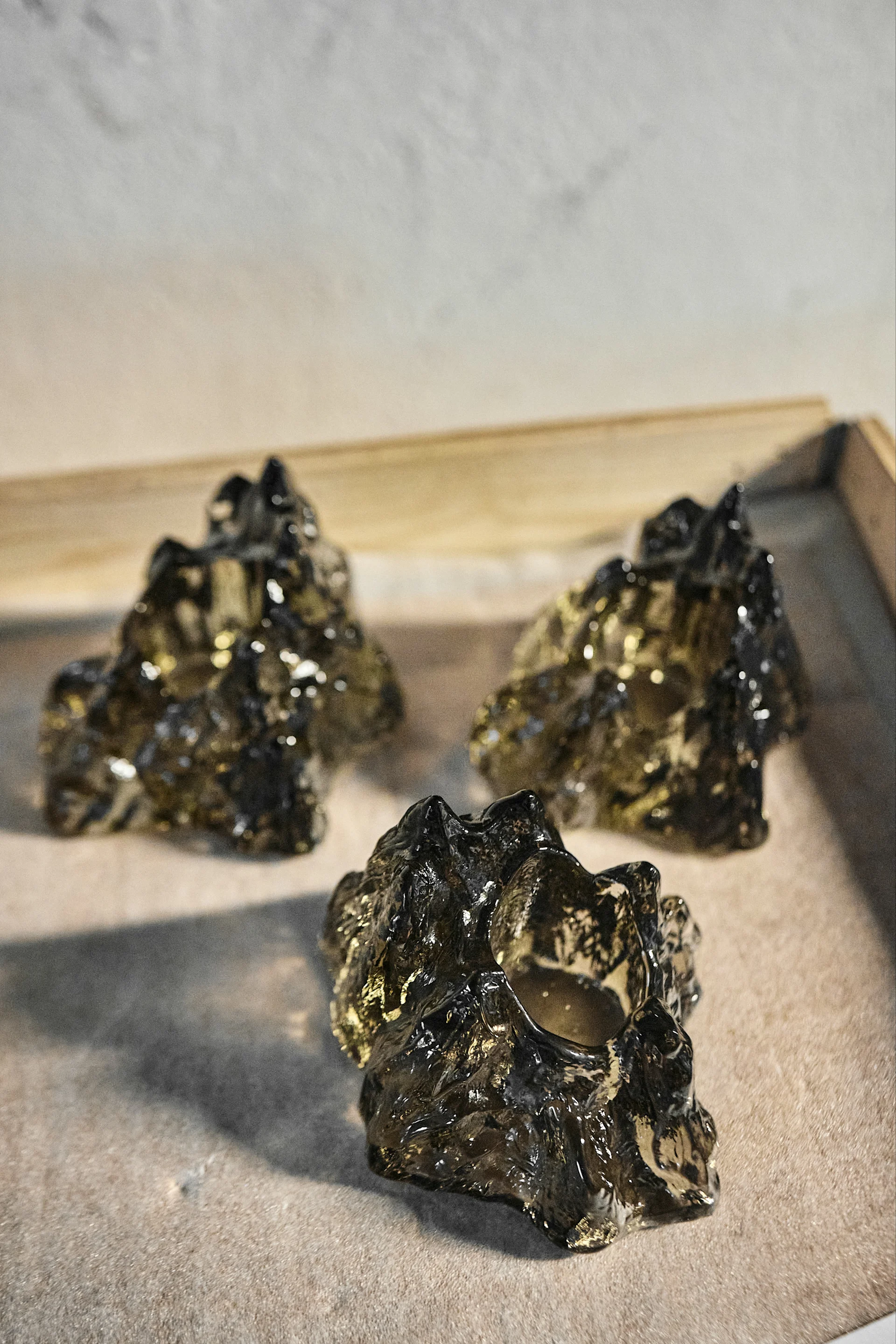 Jokainen Rock-lasiesine valetaan kolmiosaisessa metallimuotissa, mikä vaatii äärimmäistä tarkkuutta ja tiimityötä. ”Jotta jokainen esine olisi ehjä, lasinpuhaltajamme työskentelevät tiiviissä kolmen hengen tiimissä”, Amanda selittää. ”Valun jälkeen esineet jäähdytetään 12 tuntia jäähdytyshihnalla, jotta lasi stabiloituu hitaasti ja tasaisesti.”