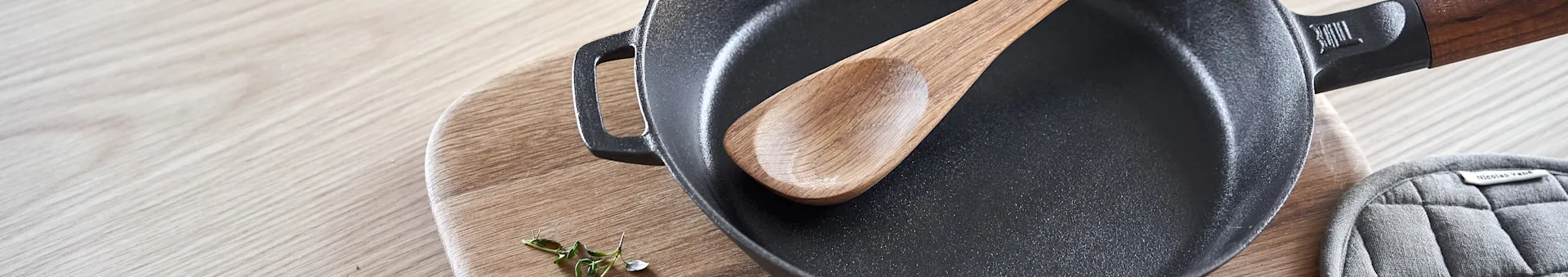 Merkin Fiskars valikoimasta löydät joitakin parhaita valurautapannuja eri kokoisina ja tyyleinä. Kaksi heidän suosittua kokoelmaansa ovat Norden ja Brasserie, jotka sisältävät pieniä ja suuria valurautapannuja irrotettavilla puisilla kahvoilla uunissa käytettäväksi.