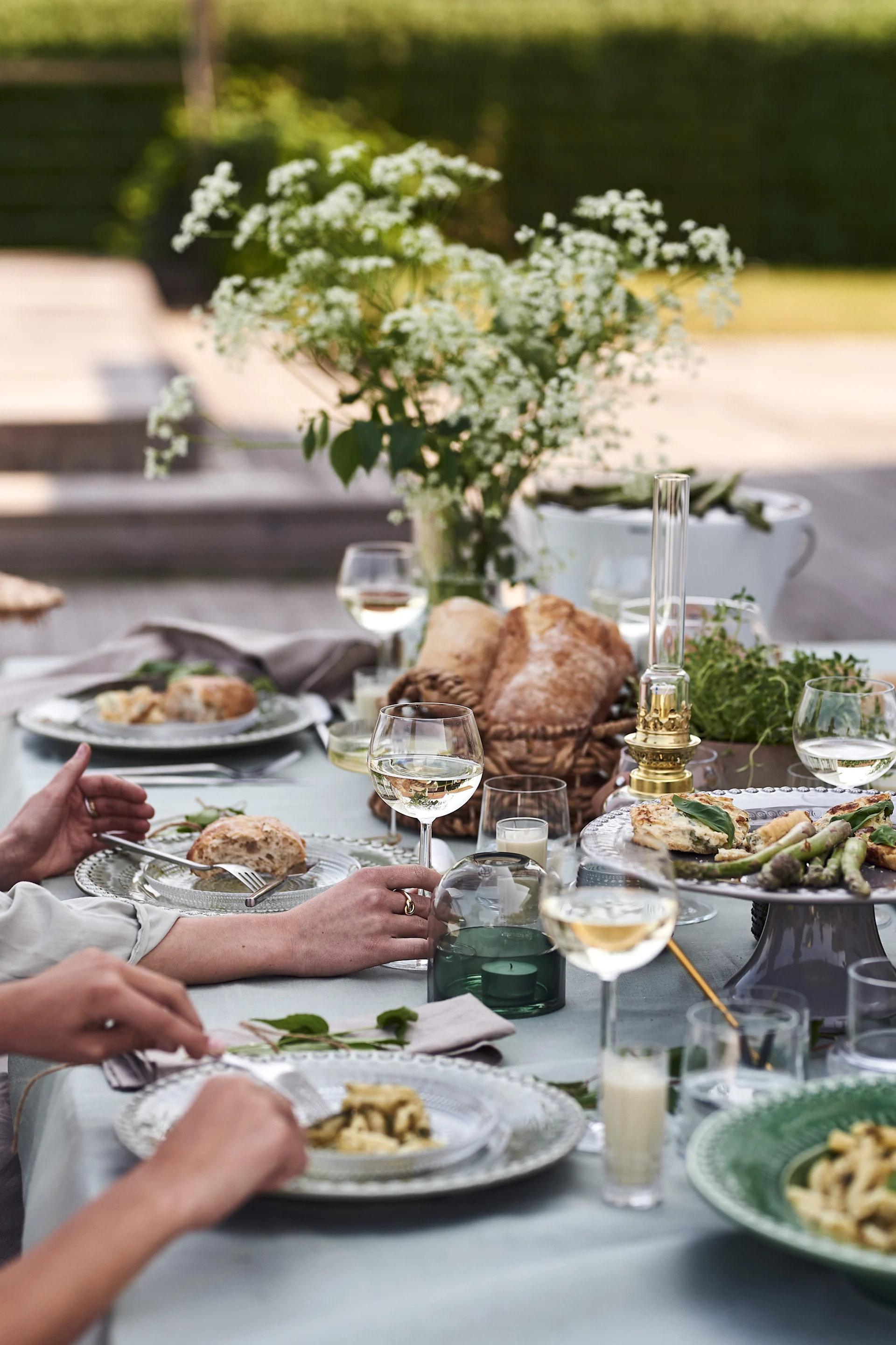 MATEUS Oyster lautanen | POTTERYJO Daria leipälautanen | IITTALA Kartio lasi | BY ON Calore kynttilälyhty-maljakko green-beige | BY ON Calore kynttilälyhty-maljakko beige | GEORG JENSEN Bernadotte viinilasit