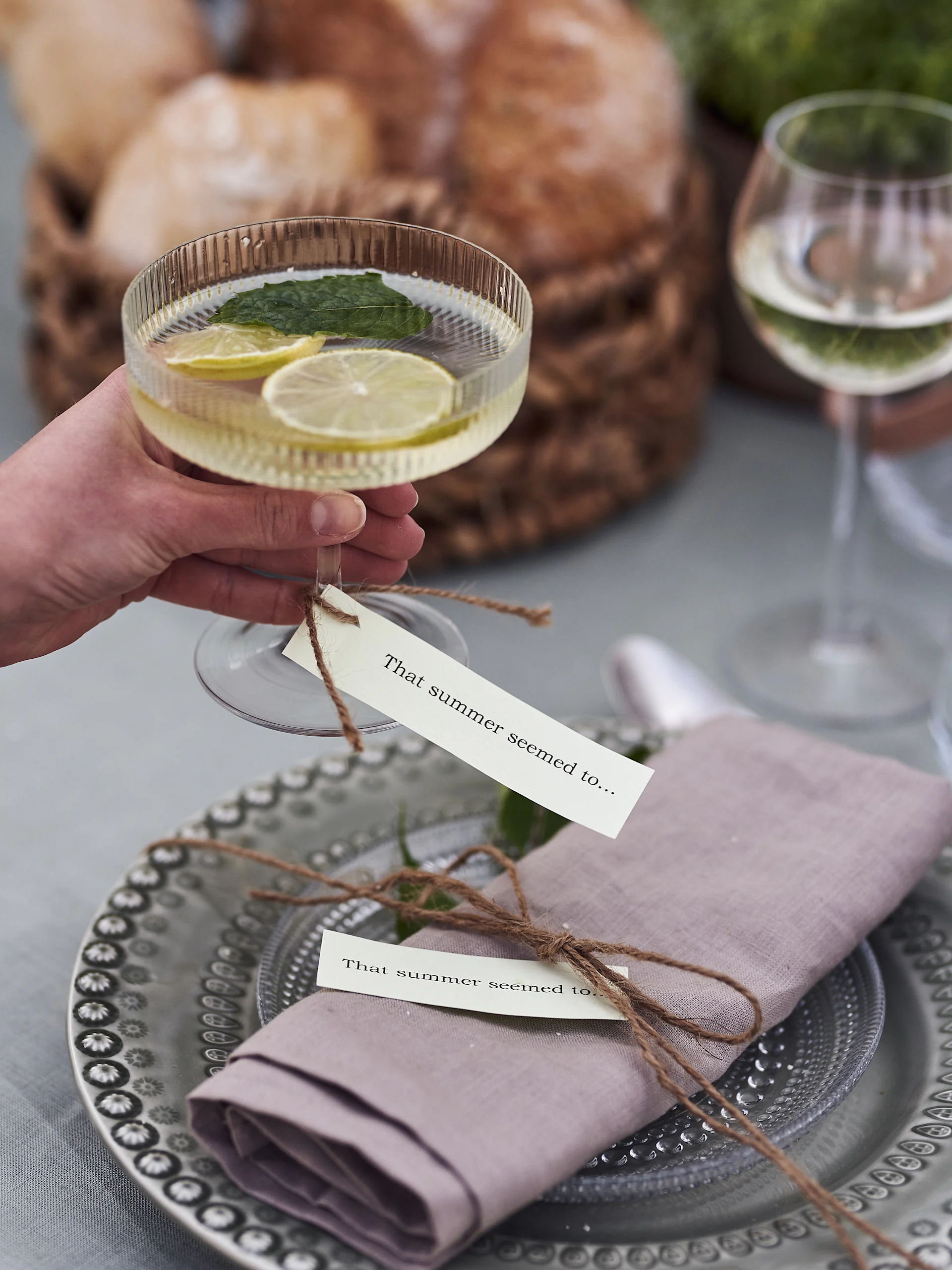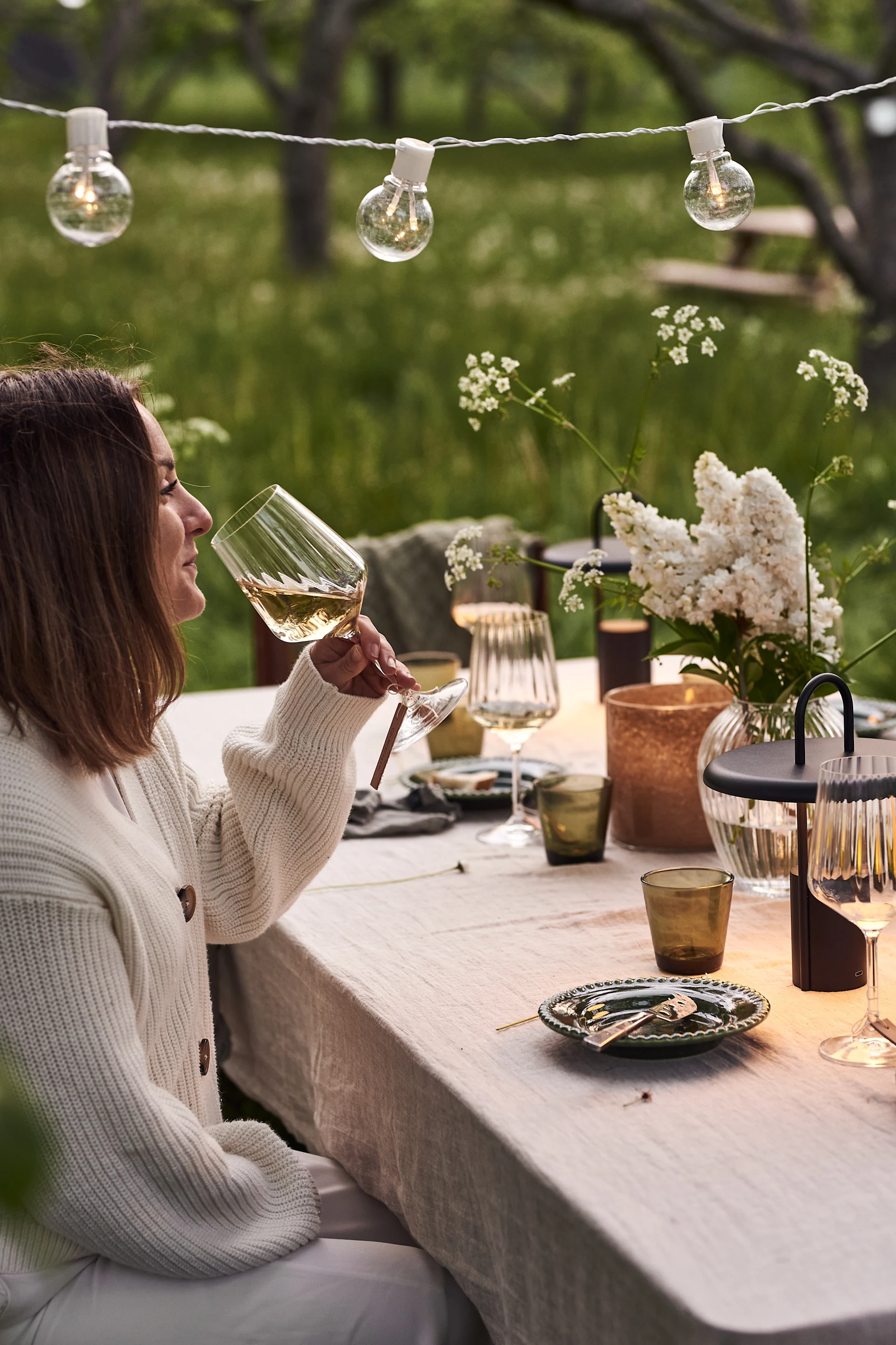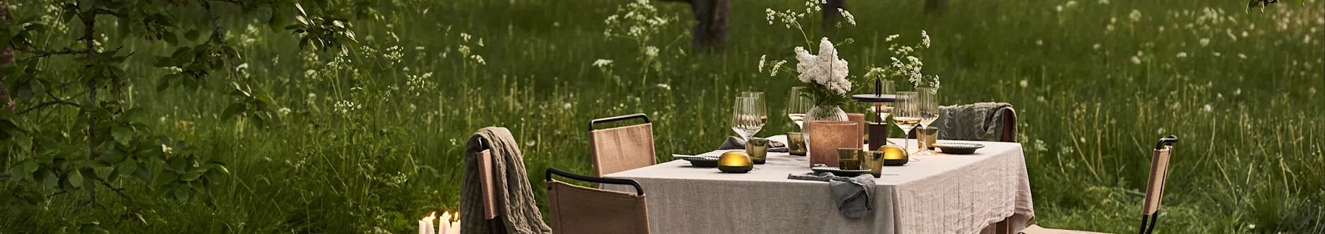 POTTERYJO Daisy ruokalautanen | IITTALA Kastehelmi asetti | AYTM Tota kynttilälyhty | ROSENDAHL Premium valkoviinilasi