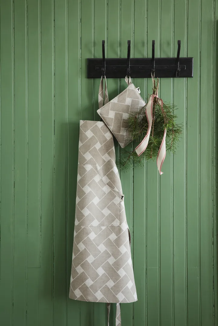 Korg XL esiliina Almedahlsilta on valmistettu puolivanhasta, koostumus 55 % pellavaa ja 45 % puuvillaa. Tämä pellava-puuvillaesiliina, jossa on tyylikäs Korg XL -kuosi, tarjoaa sekä suojaa että eleganssia keittiöön