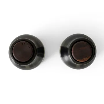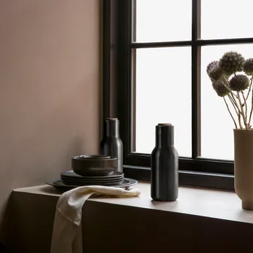 Bottle Grinder -maustemylly metallia, jonka on suunnitellut Norm Architects tanskalaiselle Audo Copenhagenille, on käyttäjäystävällinen mutta samalla leikkisä muodoltaan. Täytä Bottle Grinder suolalla, pippurilla tai haluamallasi mausteella. Tehokas keraaminen myllykoneisto on erittäin tehokas ja käsittelee käytännössä kaikkia mausteita, siemeniä ja jopa kuivattuja hedelmiä. Säätääksesi hiukkasten karkeutta, kierrä myllyn yläosassa olevaa nuppia. Innovatiivisen rakenteen ansiosta, jossa mylly on ylhäällä, keittiötasolle ei pääse valumaan kuten usein perinteisissä maustemyllyissä. Pullonmuotoinen maustemylly täytetään helposti jakamalla se kahtia. Tämä tekee myös myllyn sisältä helposti puhdistettavaksi, jos haluat vaihtaa toiseen mausteeseen. Puiset kannet luovat tyylikkään kontrastin metallille, ja maustemyllyt voidaan hyvin pitää esillä keittiössä koristeellisena yksityiskohtana myös silloin kun niitä ei käytetä