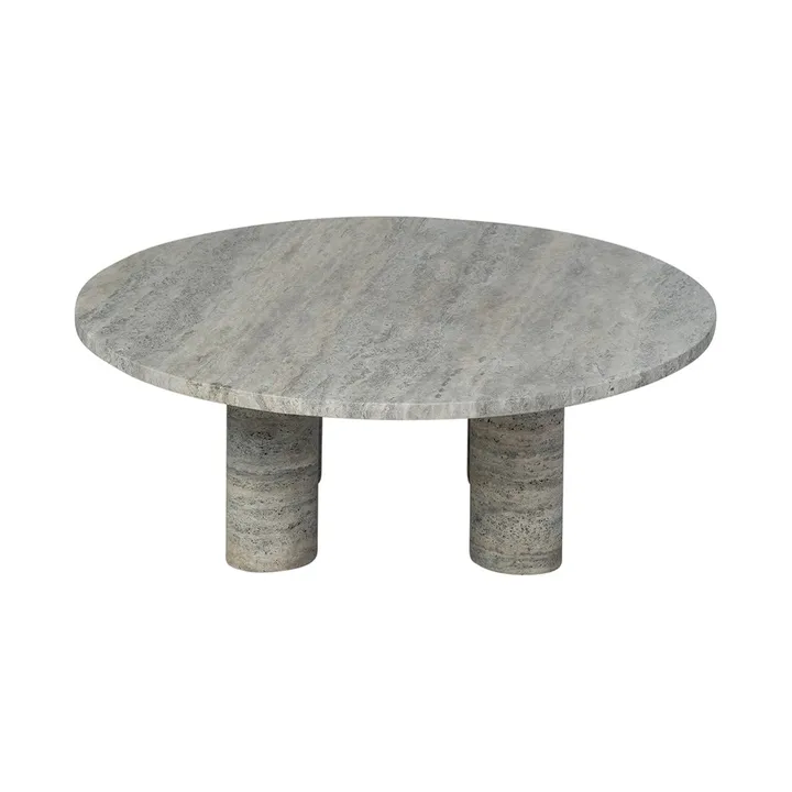 Volos-sohvapöytä L Ø75 cm, joka on valmistettu travertiinista, huokoisesta kalkkikivestä luonnollisilla reillä ja värieroilla, on blomus-tuotemerkiltä. Sebastian Herknerin suunnittelema pyöreä sohvapöytä sopii täydellisesti olohuoneen sohvan viereen.