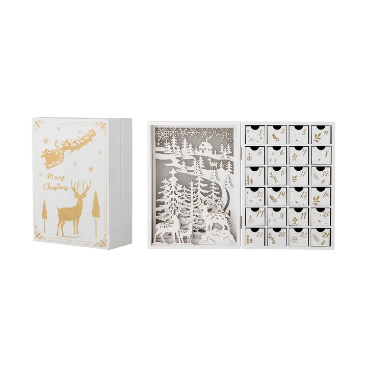 Elimar joulukalenteri valaistuksella Bloomingvilleltä on valmistettu koivuvanerista. Tämä kalenteri on muotoiltu lumoavaksi talviseksi kohtaukseksi, jossa on yksityiskohtaisia veistoksia ja sisäänrakennetut valot. Kalenterissa on 24 pientä laatikkoa, numeroitu yhdestä kahteenkymmeneenneljään, koristeltu elegantilla kullanvärisillä numeroilla. Täytä laatikot pienillä lahjoilla, makeisilla tai tervehdyksillä henkilökohtaista jouluaaton laskentaa varten.