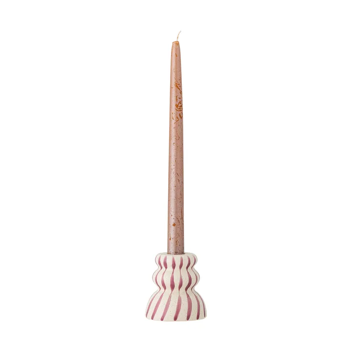 Gabin kynttilänjalka 8 cm Bloomingvillelta yhdistää kivitavaran ja käsin maalatut raidat vaaleaa taustaa vasten. Graafinen muotoilu luo harmonisen ja katseenvangitsevan vaikutelman. Jokainen kynttilänjalka on uniikki käsin maalatun kuvioinnin ansiosta, mikä tekee siitä persoonallisen ja monikäyttöisen lisän sisustukseesi.