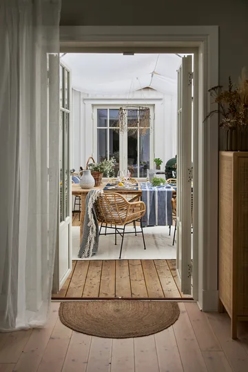 Merida kynnysmatto 60x90 cm Boel & Janilta on puolikuun muotoinen matto, joka on valmistettu luonnonmateriaalista juteista. Punottu kynnysmatto auttaa keräämään likaa ja hiekkaa kengistä samalla kun se antaa eteiselle kutsuvan ja lämpimän tunteen. Jutematto on lisäksi kestävä ja hyvä sijoitus, joka ei vahingoita ympäristöä