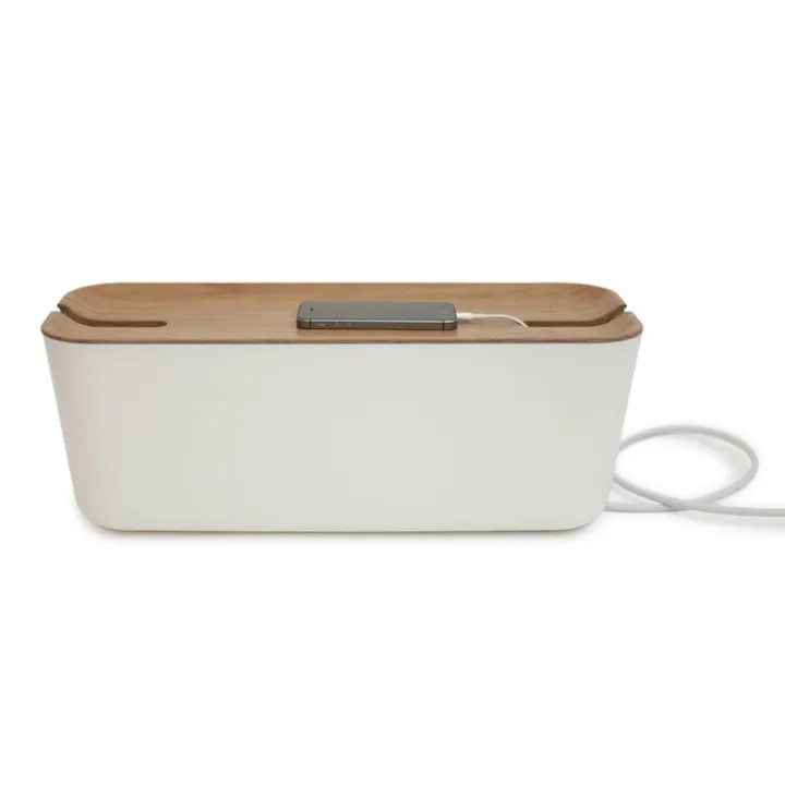 Unohda takkuiset johdot, rumat jakorasiat ja sotkuiset johtovyyhdit! Cable Organiser Hideaway piilottaa helposti kaikki elektroniset laitteet ja johdot ja varmistaa, että johdot eivät sotkeudu. Tämä helpottaa myös siivousta. Johtopiilon on suunnitellut Jonathan Maltz ja siinä on useita älykkäitä ominaisuuksia. Se on valmistettu liekinkestävästä muovista ja siinä on useita tuuletusaukkoja. Kansi sulkeutuu kätevästi napsauttamalla, joten se pysyy hyvin paikoillaan. Laatikon pohjassa on silikonijalat, joidan ansiosta se pysyy hyvin paikoillaan eikä naarmuta alustaa. Tähään isoon Cable Organiseriin mahtuu iso jakorasia ja koko perheen matkapuhelimet latureineen, sekä vielä muuta elektroniikkaa, jonka haluaa pitää piilossa.