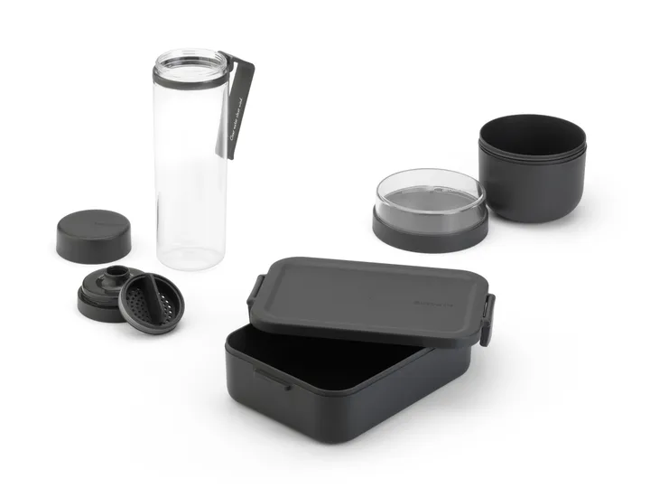 Make & Take -aamiais- ja lounassetti 3 osaa Brabantialta on älykäs ja käytännöllinen setti, joka sopii niille, jotka haluavat ottaa ruokansa ja juomansa mukaan helposti ja kestävästi. Setti sisältää litteän eväsrasi an, joka mahtuu laukkuun mutta vetää neljä voileipää, vesipullon, jossa on sisäänrakennettu sihti suun alla ja vuotamattoma n kansi, sekä kulhon kannella, joka sopii täydellisesti jogurtille ja mysliille. Toimii yhtä hyvin työmatkalla kuin piknikillä — helppo puhdistaa, kuivat a ja käyttää uudelleen uudelleen. Harkittu valinta arjen ruokailuhetkiin