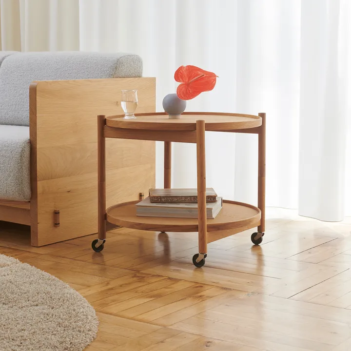Bølling Tray Table model 60 rullapöytä Brdr. Krügeriltä on elegantti tarjotinpöytä massiivipuusta, joka yhdistää ajattoman muotoilun ja toiminnallisen käytön. Hans Bøllingin vuonna 1963 suunnittelema malli on muodostunut ikoniksi tanskalaisen muotoilun historiassa. Liikkuvilla pyörillä ja käännettävillä tarjottimilla pöytä tarjoaa joustavan ratkaisun tarjoiluun, säilytykseen tai tyylikkääksi yksityiskohdaksi olohuoneeseen. Huolellinen rakenne tekee pöydän siirtämisestä ja tarpeiden mukaan mukauttamisesta helppoa, käytössä arjessa tai juhlassa