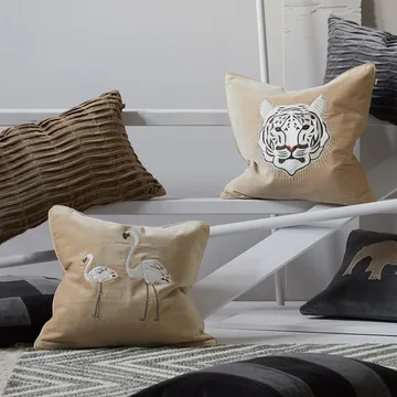 Kirjailtu tiikeri-tyynyliina 50x50 cm Chhatwal & Jonssonilta on runsaasti koristeltu tyynyliina, jossa ilmeikäs tiikerin kasvot on kirjailtu käsin ja koneella. Pehmeä tuntu ja kirjailun yksityiskohdat herättävät sohvan tai nojatuolin eloon ja luovat huoneeseen persoonallisen katseenvangitsijan. Täydellinen yhdistettäväksi yksiväristen tekstiilien kanssa kontrastin luomiseksi tai annettavaksi omaksi leikilliseksi ja taiteelliseksi yksityiskohdakseen makuuhuoneessa. Tyylikäs tapa tuoda kotiin luonnetta ja käsityötä