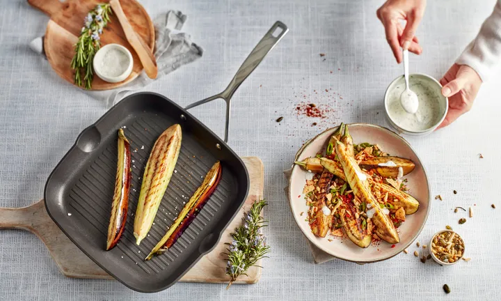 Demeyere Alu Pro -grillipannu on valmistettu kestävästä, titaanikuvioidulla pinnoitteella varustetusta alumiinista ja siinä on tukeva, neliömäinen muoto, joka sopii erinomaisesti kaikesta kalasta ja vihanneksista suuriin pihveihin. Erityiskäsitelty pohjalevy takaa erinomaisen lämmönjakautumisen ja sisäpinnan kuvio muodostaa täydelliset grilliraidat. Varustettu tyylikkäällä, ergonomisella ruostumattomasta teräksestä valmistetulla kahvalla