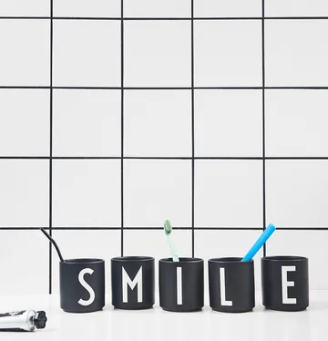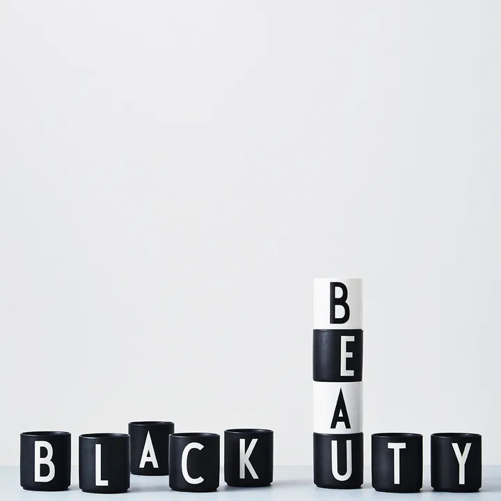 Design Lettersin suosittu kirjainkuppi on nyt saatavana myös mustapohjaisena! Kuppia koristaa Arne Jacobsenin tunnettu vintage-kirjasinlaji vuodelta 1937. Kuppi on posliinia ja sitä voi käyttää paitsi juomille, myös säilytykseen tai vaikka kynäpurkkina.