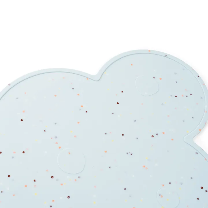 Confetti pöytätabletti 31x50 cm Done by deeriltä on valmistettu 100% silikonista. Tämä söpö pilven muotoinen pöytätabletti on koristeltu hauskalla konfetilla, täydellinen pieniin juhliin. Pieni koholla oleva reuna estää roiskeet ja silikoni pitää sen paikoillaan liukumattomuutensa ansiosta