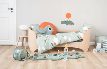 Croco matto 46x110 cm Done by Deeriltä on valmistettu villasta. Tämä hurmaava, krokotiilin muotoinen matto tuo lastenhuoneeseen leikkisyyttä ja turvallisuuden tunnetta. Pehmeä pinta ja käytännölliset anti-slip-dots takapuolella tekevät Crocosta täydellisen hauskoihin ja ikimuistoisiin hetkiin.
