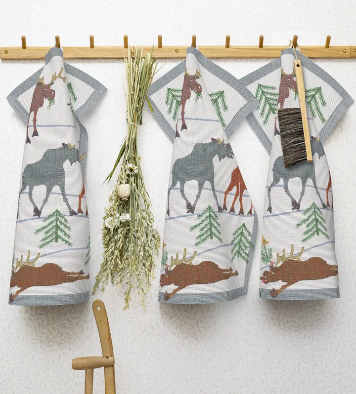 Clumsy moose -keittiöpyyhe Ekelundin ruotsalaiselta valmistajalta on valmistettu GOTS-sertifioidusta luomupuuvillasta, ja kuosin on suunnitellut Daiva Zubriene. Korkealaatuinen keittiöpyyhe, jonka humoristinen hirvikuosi on takuulla katseenvangitsija keittiössä