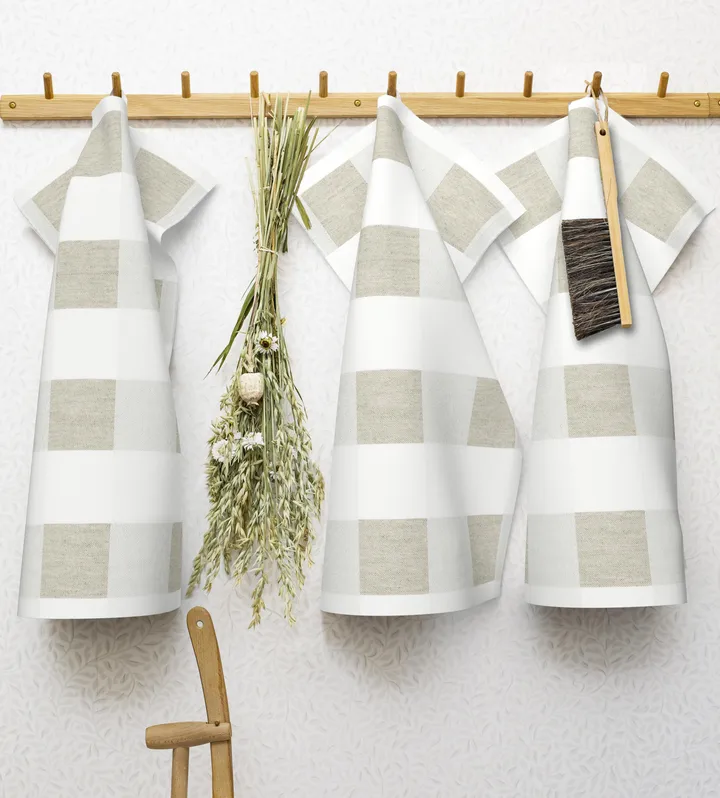 Schack keittiöpyyhe suomalaiselta Ekelundilta on valmistettu sekoituksesta GOTS-sertifioitua luomupuuvillaa ja pellavaa, ja sen kuvion on suunnitellut Hanne Vedel. Ruudullinen keittiöpyyhe korkealaatuisesta materiaalistaan tekee siitä luonnollisen osan keittiötä