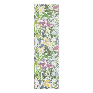 Luo kesäinen ja värikäs kattaus Sommartid kaitaliina -loperilla, joka on valmistettu ruotsalaiselta Ekelund Linneväveriltä ja suunniteltu Leif Holgerssonin toimesta. Kaitaliina on kudottu puhtaasta puuvillasta ja siinä on ihastuttava kuvio, jossa on suomalaisittain tai tavallisesti suomalaiseen korvaan sopiva sekoitus kesäkukkia sateenkaaren kaikissa väreissä. Kaitaliina on kaunis yksityiskohta katetulla pöydällä ja sopii sekä arkeen että juhlaan