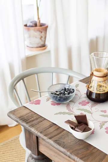 Vindvallmo kaitaliina ruotsalaiselta Ekelundilta on valmistettu GOTS-sertifioidusta luomupuuvillasta, ja kuvion on suunnitellut Virtuelli Design. Kukallinen kaitaliina on piste i:n päällä katetussa pöydässä ja sen voi asettaa suoraan pöytälevylle tai verhon päälle