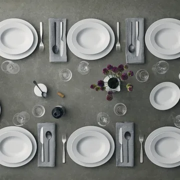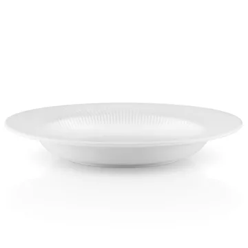 Eva Trio Legio Nova -sarjan soikea syvä lautanen on suunniteltu yhdessä Tanskan kokkimaajoukkueen kanssa ottaen huomioon heidän rakkautensa ruokaan. Lautanen on kestävää posliinia ja sen reunan raidoitus antaa kauniit kehykset ruoka-annokselle.