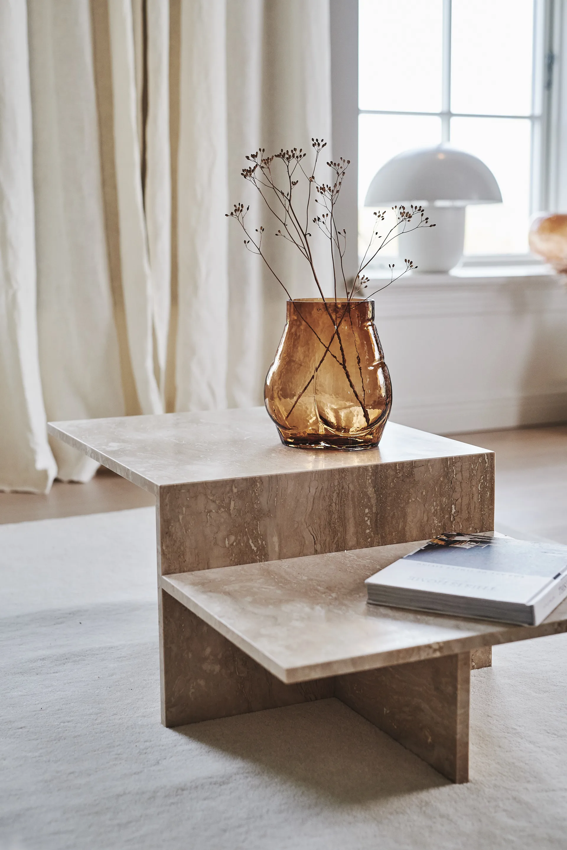 Distinct sohvapöytä Ferm Livingiltä on sohvapöytä, jonka muotoilu ammentaa vaikutteita japanilaisesta minimalismista, jossa selkeä muoto kohtaa luonnon ilmaisun. Travertiinin hiekanvärinen kalkkikivi tarjoaa lämpimän, tuntuvan pinnan ja rustiikkisen luonteen, joka korostaa tilaa ilman että valtaa sen. Distinctissa korostuvat arkkitehtuuri ja tasapaino — matala, huolellisesti mitoitettu rakenne muodostaa koristeellisen keskipisteen sohvan edessä tai lukunurkkauksessa. Kivessä esiintyvät vaihtelut tekevät jokaisesta kappaleesta ainutlaatuisen, täydellinen valinta, jos haluat huonekalun, jossa on luonnollista persoonallisuutta ja ajaton läsnäolo