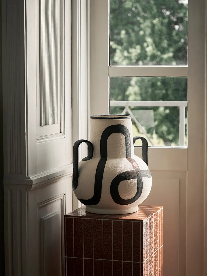 Trace maljakko Ferm Livingiltä on käsinmaalattu maljakko, jonka elegantti, graafinen viiva luo kontrastin sen pehmeälle muodolle. Viiva päättyy kahvaan, mikä tuo vaikutelman liikkeestä ja kolmiulotteisesta ilmeestä. Reilu koko tekee maljakosta täydellisen lattiavaasiksi tai runsaille kukka-asetelmille pöydälle. Koska jokainen maljakko on käsinmaalattu, pienet vaihtelut ovat mahdollisia, mikä tekee juuri sinun maljakostasi ainutlaatuisen ja persoonallisen kotona.