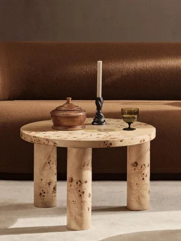 Post sohvapöytä pieni Ø65 cm from Ferm Living on pyöristetty, arkkitehtoninen sohvapöytä, jossa brutalistisen raskaat tilavuudet kohtaavat taitavan käsityön. Runsasta ilmettä tasapainottavat yksityiskohtaiset elementit — kolme tukevasti muotoiltua sylinterimaista jalkaa ja elegantit tammiviiluiset yksityiskohdat, jotka on tehty marquetry-tekniikalla. Valmistettu FSC™-sertifioidusta puusta, pöytä toimii luonnollisena kokoontumispaikkana olohuoneessa, yksinään tai yhdessä suuremman mallin kanssa taiteelliseksi, kerrokselliseksi ilmeeksi. Ajaton valinta, jos haluat muotoilun, joka sekä näkyy että tuntuu