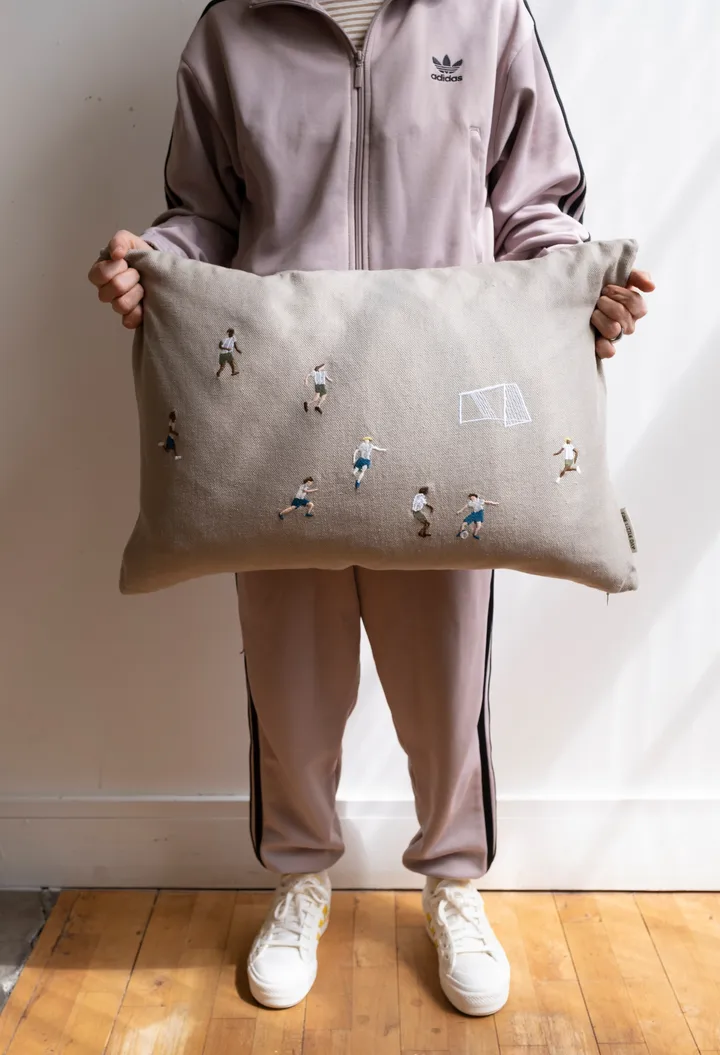 Soccer jalkapallo tyynyliina 58x38 cm Fine Little Daylta on leikkisä ja ilmeikäs tyynyliina, jonka on suunnitellut Elisabeth Dunker. Kuvion energia vangitsee yhteenkuuluvuuden ja pelionnen tunteen, maalattu alkuperäisillä akryyli- ja viivamaalauksilla. Valmistettu pehmeästä, tukevasta pellavakankaasta, jossa on kirjontadetaljeja tekstuuria ja syvyyttä varten. Huomaamaton alareunan vetoketju tekee sisätyynyn vaihtamisesta helppoa (sisältö ei kuulu). Täydellinen lastenhuoneeseen, lukunurkkaan tai lämpimäksi yksityiskohdaksi sohvalle, joka herättää keskustelua ja hymyn
