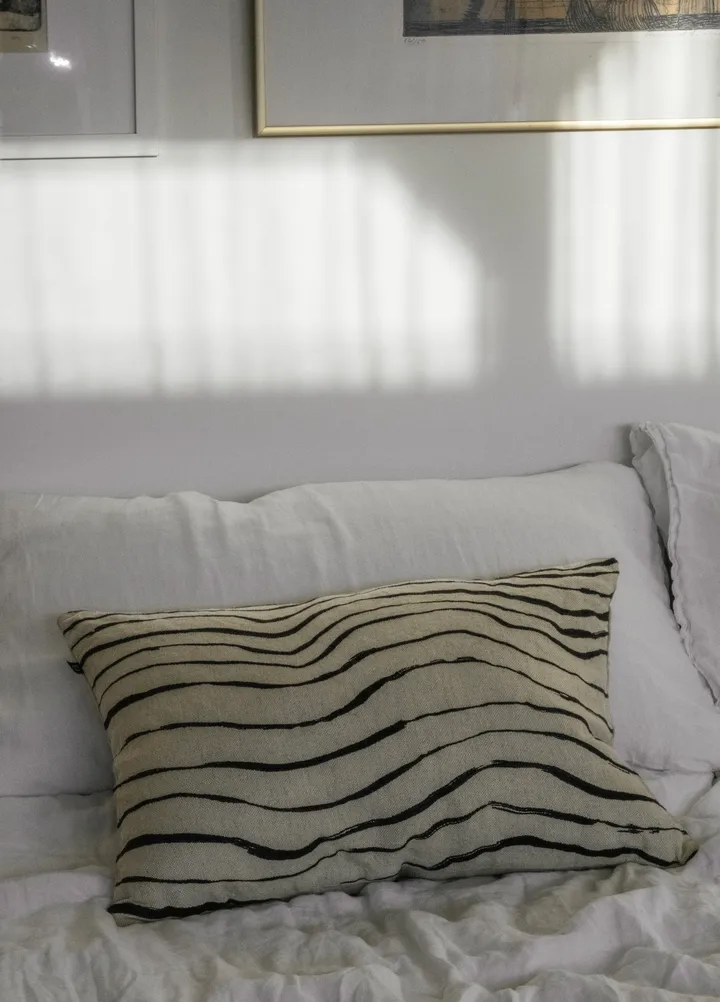 Våg tyynynpäällinen 38 x 58 cm Fine Little Daylta on valmistettu pehmeästä, vahvasta valkaisemattomasta pellavakankaasta ja siinä on kirjailtu aaltokuvio. Tyynynpäällön on suunnitellut Emilia Ilke ja se kuuluu Sea Sea Sea -sarjaan, joka kunnioittaa merta ja sen kätkettyjä aarteita