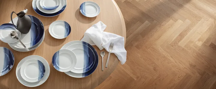 Koppel lounaslautanen koriste Ø22 cm merkiltä Georg Jensen on valmistettu posliinista ja koristeltu tyylikkäillä siveltimenvedoilla eri sinisen sävyissä. Tämä yksityiskohta heijastaa Henning Koppelin intohimoa käsimaalattuihin motiiveihin ja antaa taiteellisen tunteen kattaessa.