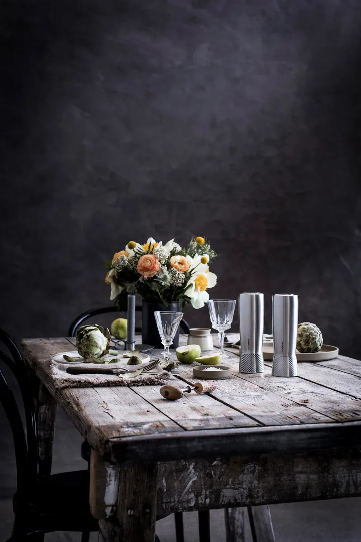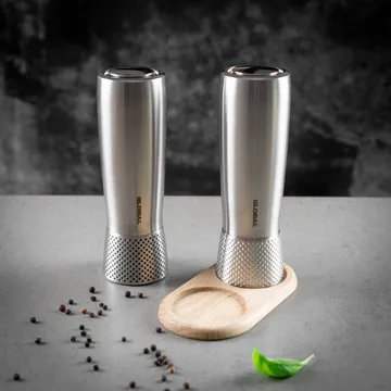 Global Suola- ja Pippurimyllysetti 18 cm on valmistettu kestävästä ruostumattomasta teräksestä ja varustettu innovatiivisella CrushGrind-jauhimekanismilla, joka mahdollistaa tarkasti säädettävän jauhamisen. Setissä on kaksi myllyä: valkoinen suolalle ja musta pippurille, molemmat tyylikkäillä Globalin täpläkoristeilla. Näiden myllyjen avulla maustaminen on helppoa ja nautinnollista – täydellinen lisä jokaiselle keittiölle!