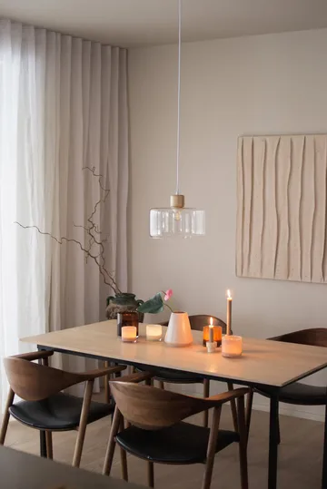 DOT 30 -riippuvalaisin Globen Lightingilta on elegantti lamppu, jonka on suunnitellut Roger Persson. Inspiraatio tulee korkillisesta lasipullosta, jossa tunnusomainen puunuppi luo lämpimän kontrastin kirkkaaseen lasikupuun. Suupuhallettu lasi antaa jokaiselle riippuvalaisimelle yksilöllisen ilmeen ja levittää pehmeää, miellyttävää valoa. DOT sopii yksittäisenä pöydän ylle tai ryhmänä, kun halutaan veistoksellisempi valon kokonaisuus. DOT 30 -riippuvalaisin Globen Lightingilta yhdistää yksinkertaisuuden, materiaalintunnun ja ajattoman muotoilun.