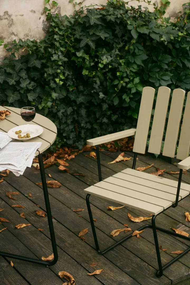 9A ruokapöytä Grythyttan Stålmöblerilta on pyöreä pöytä, jonka on suunnitellut Artur Lindqvist ja joka kuuluu Klassiker-sarjaan. Pöytä on valmistettu kestävästä teräksestä ja sopii yhtä hyvin terassille kuin puutarhapaviljonkiin, jossa se luo elegantin ja kutsuvan paikan yhteisille hetkille. Järeä rakenne takaa pitkäikäisyyden, ja pelkistetty muotoilu sointuu eri ulkokalusteiden, kuten A2:n tai Stol 1:n, kanssa. 9A ruokapöytä yhdistää perinteisen ruotsalaisen käsityön moderniin toiminnallisuuteen ja on täydellinen sekä rentoihin hetkiin että mukaviin ulkoiltaisiin illallisiin