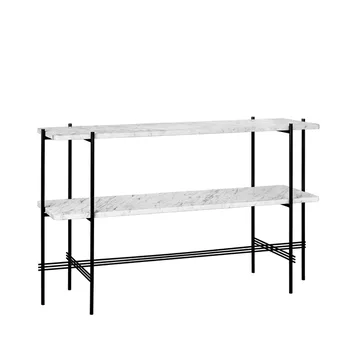 TS Console pöytä 120x30x72 cm, White carrara marble, musta runko, 2 marmorihyllyä GUBI