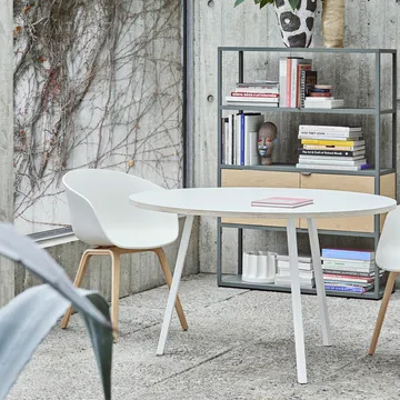 Loop Stand ruokapöytä pyöreä HAYlta on Leif Jørgensenin suunnittelema. Erottuva jalkarakenne kiinnittyy suoraan pöytälevyyn ja tarjoaa käytännöllisen sekä kestävän ratkaisun kotiisi. Yli 200 cm pöytälevyille suositellaan Loop Stand Support -tukea, joka ehkäisee mahdollisen notkumisen tai kaartumisen ajan myötä.