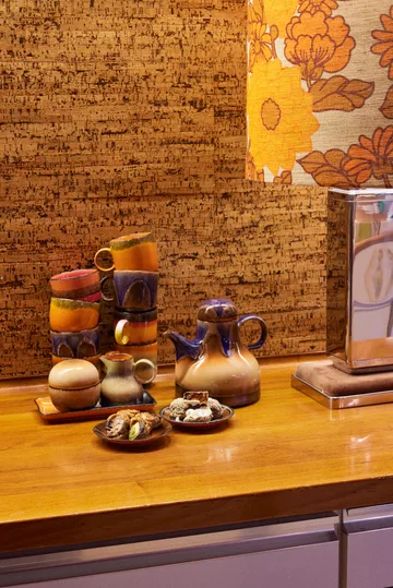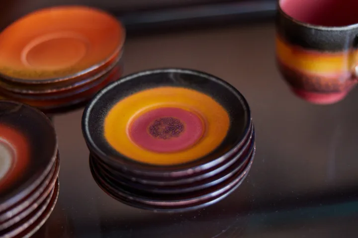 HKlivingin 70-luvun kahvilautanen Ø11,5 cm on valmistettu kestävästä kivitavarasta. Tämä 70-luvun sarjaan kuuluva pyöreä kahvilautas on värikäs kunnianosoitus kahvikulttuurille. Runsas, lämmin väripaletti ja ainutlaatuiset kuviot luovat visuaalisen juhlan, joka kutsuu nauttimaan kahvista aitoon vintage-tyyliin.