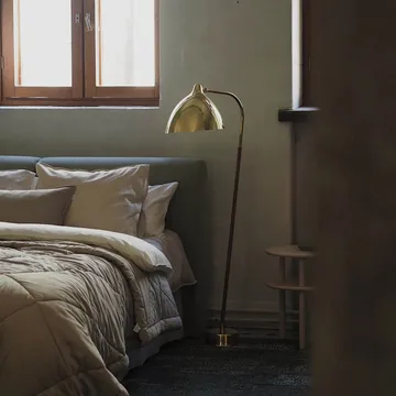 Lita lattiavalaisin Innoluxilta, suunnitellut Lisa Johansson-Pape, on ajaton designhelmi. Messingin sävyinen kellomallinen kupoli suuntaa valon tarkasti alaspäin. Jalusta, verhoiltu käsintehdyllä cognac-värisellä nahalla, antaa tunteen ylellisyydestä. Osa arvostettua Lisa-kokoelmaa, tämä lamppu yhdistää elegantin muodon ja toiminnallisuuden tilan kohottamiseksi