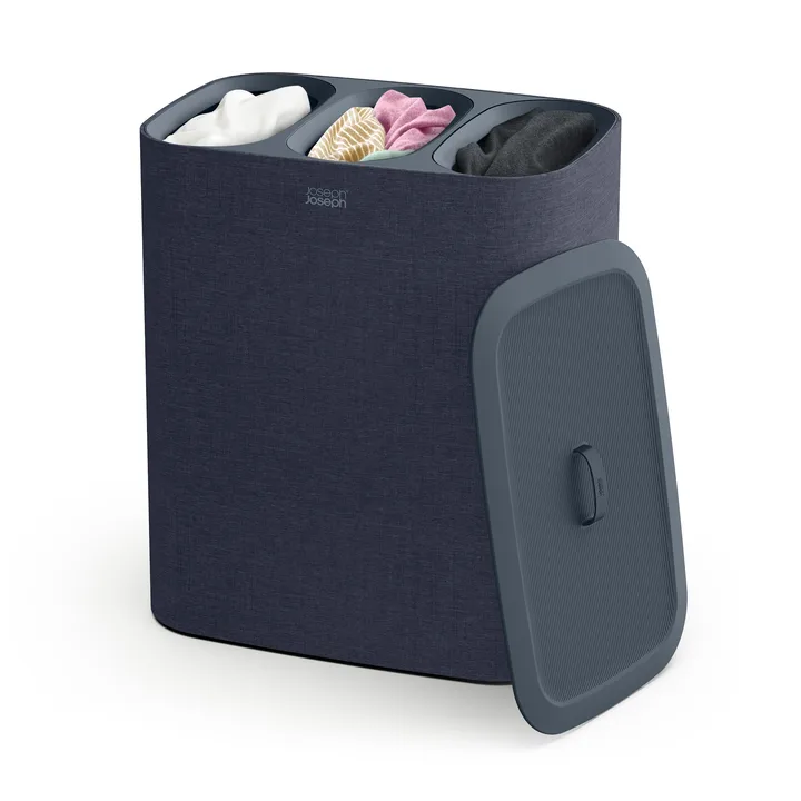 Tota Trio pyykkikori 90 L Joseph Josephilta sisältää kolme 30 litran kangaspussia, jotka tekevät vaatteiden lajittelusta helppoa vaaleisiin, tummiin ja värillisiin tekstiileihin. Pusseissa on ylhäällä kantokahvat vaivattomaan siirtämiseen sekä apukahva alhaalla helppoa tyhjennystä varten. Itseohjautuva reuna varmistaa, että pussi asettuu käytön jälkeen napakasti paikoilleen. Kankainen ulkopinta sopii monenlaiseen sisustukseen ja on ihanteellinen kylpyhuoneeseen, makuuhuoneeseen tai kodinhoitohuoneeseen.