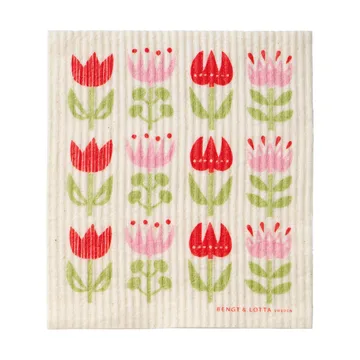Tulip tiskirätti 17x20 cm Klippan Yllefabrikilta on valmistettu kompostoituvasta selluloosasta ja puuvillasta. Sen viehättävä tulppaanikuvio, jonka ovat suunnitelleet Bengt & Lotta, tekee siitä paitsi käytännöllisen siivoukseen ja roiskeiden pyyhkimiseen, myös silmänilon. Yhdistä mielellään muihin tuotteisiin Tulip-sarjassa.