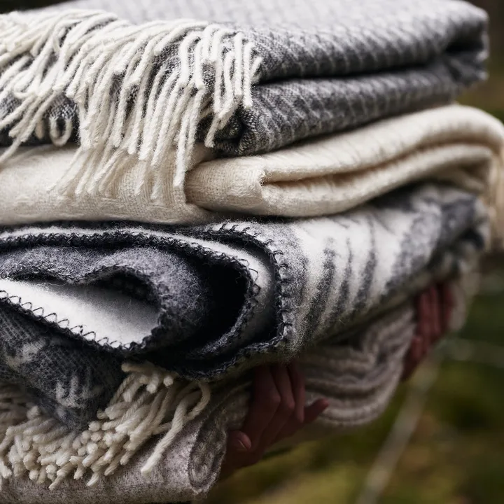Pehmeä ja kaunis, 100 % ekologisesta villasta valmistettu huopa, jossa on hillitty, kudottu kuvio. Klassinen ja ajaton huopa Klippan Yllefabrikilta.
