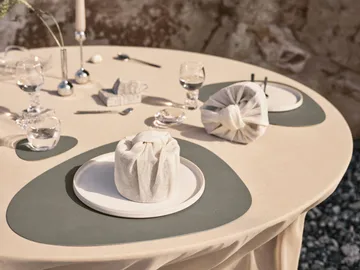 LIND DNA:n Curve Nupo Double -lasialustassa on samanlainen tunnusomainen muotoilu kuin pöytätabletissa. Sen dynaaminen ja elävä muoto tuo kattaukseen eloa ja dynamiikkaa. Lisäksi lasialusta on valmistettu kestävästä kierrätetystä nahasta ja luonnonkumista, mikä antaa sille kestävän pinnan, joka ei ole yhtä herkkä kuin perinteinen nahka. Materiaali on likaa ja vettä hylkivä ja se on erittäin helppo puhdistaa.