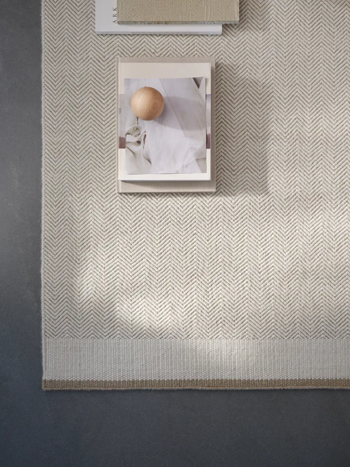 Stratum Echo villamatto tanskalaiselta Linie Designiltä on valmistettu villasta, jossa on pellavainen kude. Käsinkudottu matto on koristeltu hillityllä chevron-kuviolla ja kontrastivärisillä päissä. Urd Moll Gundermannin suunnittelema matto sopii yhtä hyvin olohuoneen matoksi kuin makuuhuoneeseenkin