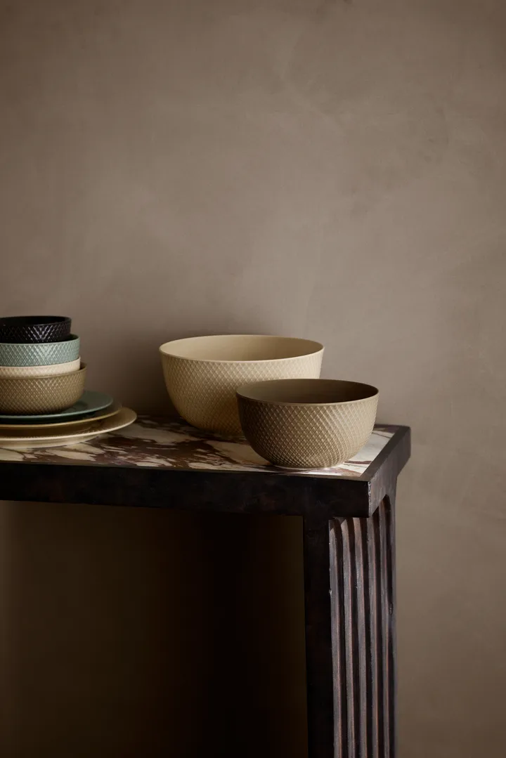 Rhombe tarjoilukulho Ø22 cm Lyngby Porcelænilta on valmistettu kiiltävälasitetusta posliinista ja siinä on koristeellinen reliefikuvio. Käytä sitä lisukkeiden tai pienten annosten tarjoiluun. Täydennä kokonaisuutta Rhombe-sarjan muilla tuotteilla, kuten lautasilla, mukeilla ja kakutarjottimella.