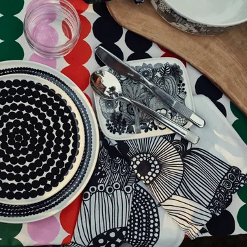 Matala Räsymatto lautanen tulee Marimekolta ja se on valmistettu korkealaatuisesta kivitavarasta. Lautanen on Sami Ruotsalaisen muotoilema ja sen musta-valkoinen täplikäs kuvio on Maija Louekarin käsialaa. Räsymatto-lautanen on kauniin kattauksen perusta.