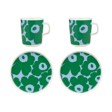 Suomalaisen Marimekon Unikko-aamiaissetti koostuu kahdesta kivitavarasta valmistetusta mukista ja kahdesta leipälautasesta, joissa on Maija Isolan 1960-luvulla suunnittelema kuuluisa Unikko-kuvio. Mukit ja leipälautaset on puolestaan muotoillut Sami Ruotsalainen. Kukallinen setti sopii hyvin niin kahvihetkeen ystävien kanssa kuin aamiaiselle perheen kesken.