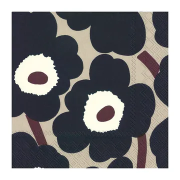 Unikko servietti 33x33 cm 20-pakkaus merkiltä Marimekko. Lautasliinan abstrakti kukkakuvio esittää juuri unikkoa. Maija Isola piirsi kuvion vuonna 1964 protestina Marimekon perustajan Armi Ratian ilmoitukselle, ettei Marimekko koskaan valmistaisi mitään kukkakuvioitua. Siksi Unikko alkoi symboloida voimaa, rohkeutta ja sitä, että itseensä tulee aina uskoa.